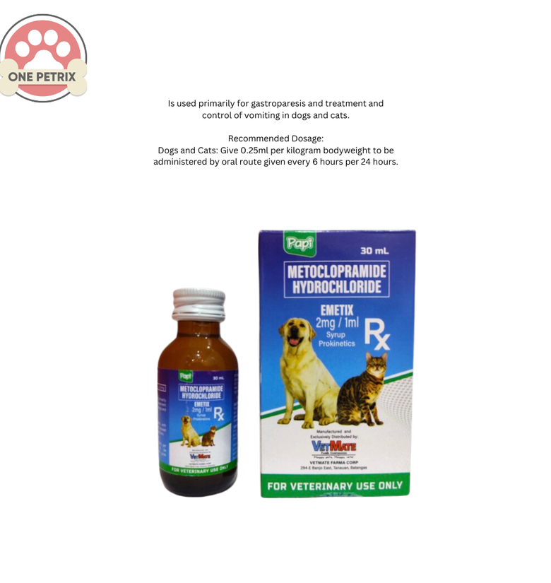The Papi Emetix for Vomiting in Dogs and Cats is a highly effective medication that helps control and treat vomiting in your furry friends. This medication contains Metoclopramide Hydrochloride and is primarily used for gastroparesis.